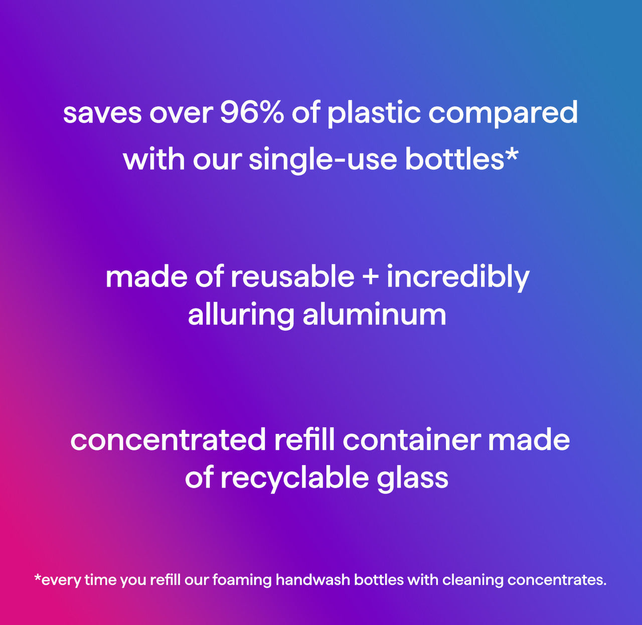 • using method’s concentrated refills + aluminum bottle saves over 96% plastic compared to our single-use plastic bottles.